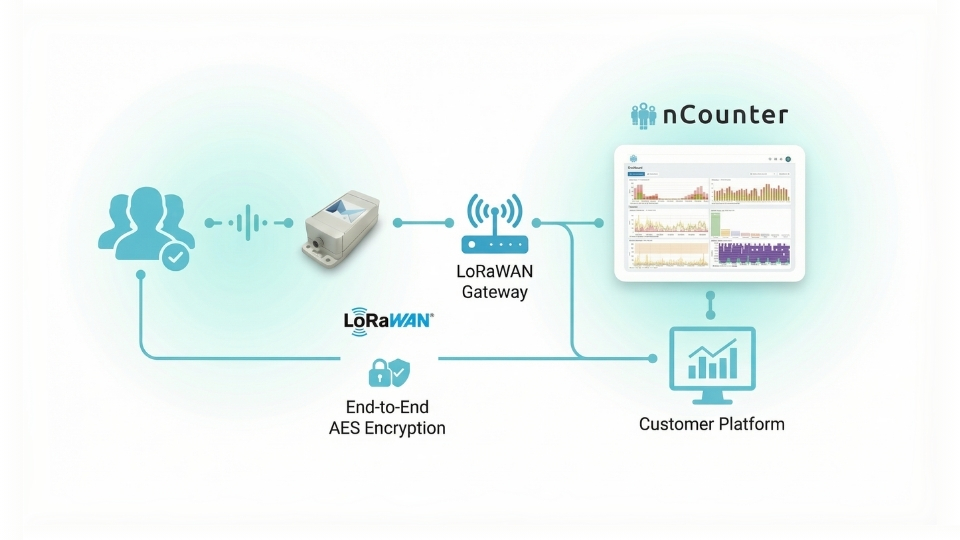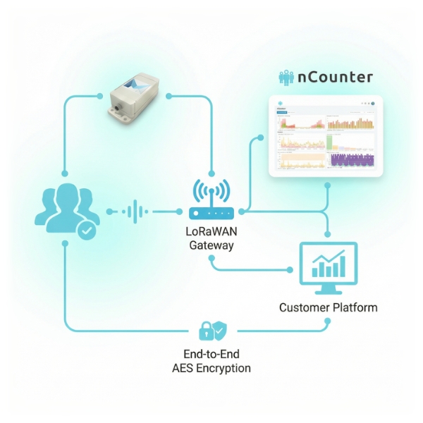 nCounter estimates footfall by anonymously detecting Wi-Fi probe requests broadcast by smartphones and other Wi-Fi enabled devices. The firmware aggregates counts in 10-minute intervals and securely transmits only aggregated totals via LoRaWAN to the dashboard.